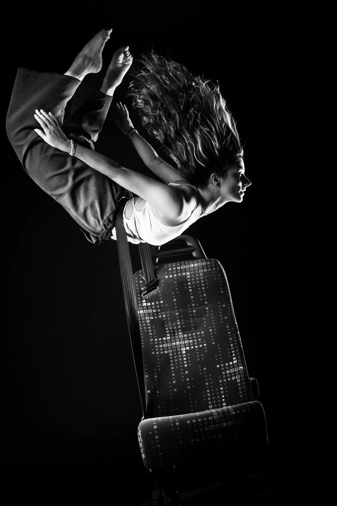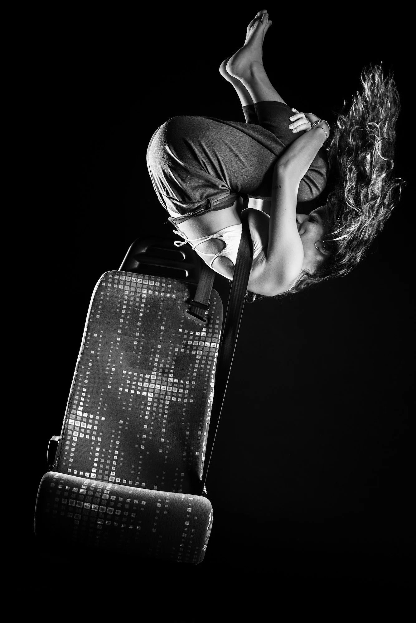 Alice, au cœur de cette chorégraphie suspendue, semble flotter hors du temps. Son corps s’arque en quête d’un élan vital, tandis que la farine, projetée comme une aura autour d’elle, matérialise l'invisible force de sa respiration, de son énergie. Elle n’est plus contrainte par la gravité. Elle s’élève, elle s’extrait du cadre et nous invite à ressentir, au-delà de l’image, cet instant de liberté pure.